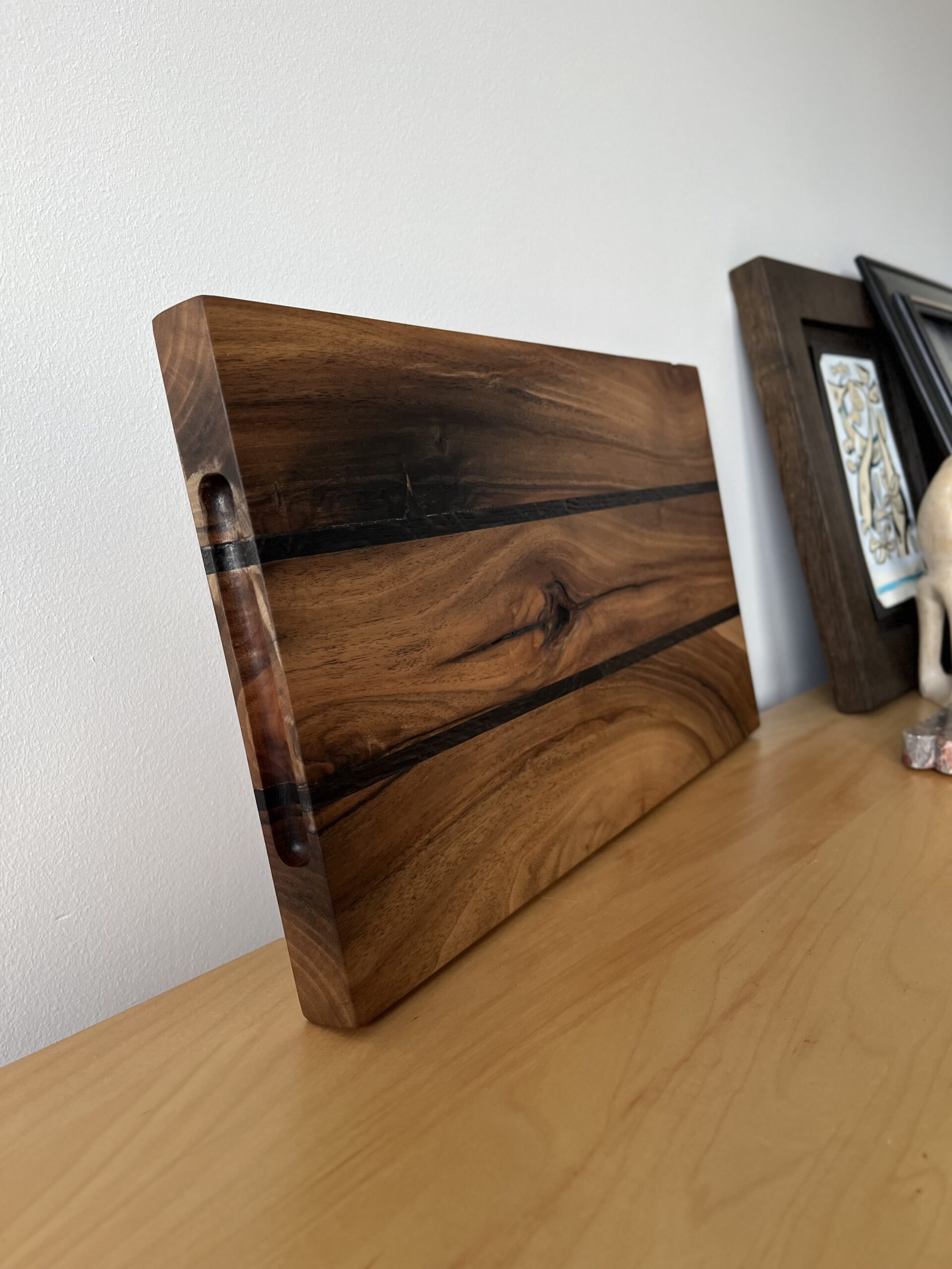 Deska do krojenia i serwowania z drewna orzecha ze wstawkami autentycznego czarnego dębu. Deska posiada boczne wygodne uchwyty w formie wyżłobienia.