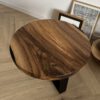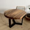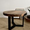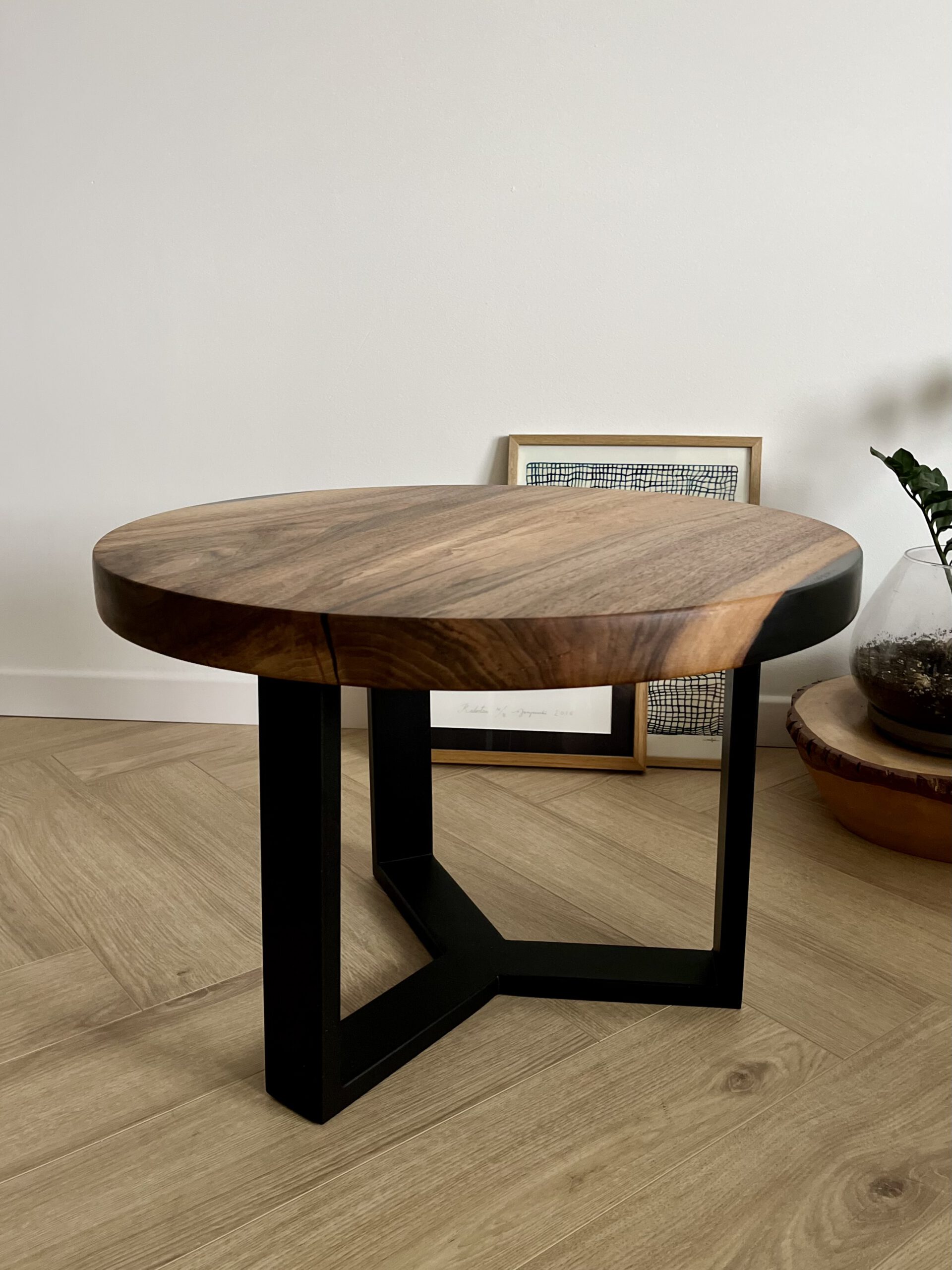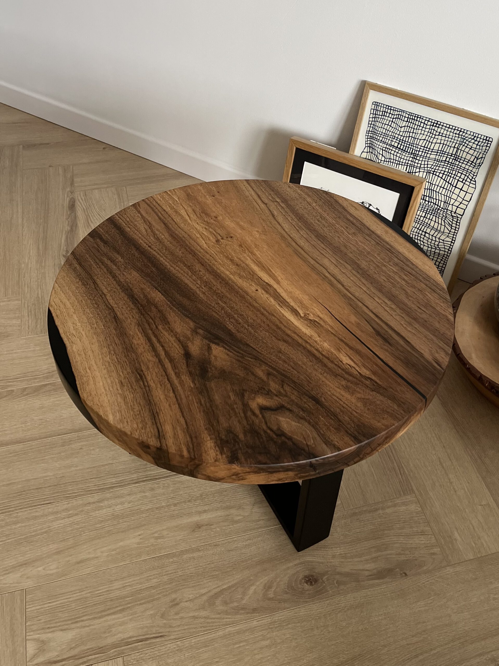 Stolik kawowy wykonany z litego drewna orzecha z czarną żywicą. Stalowa podstawa malowana proszkowo. Drewno wykończone olejem twardym.