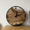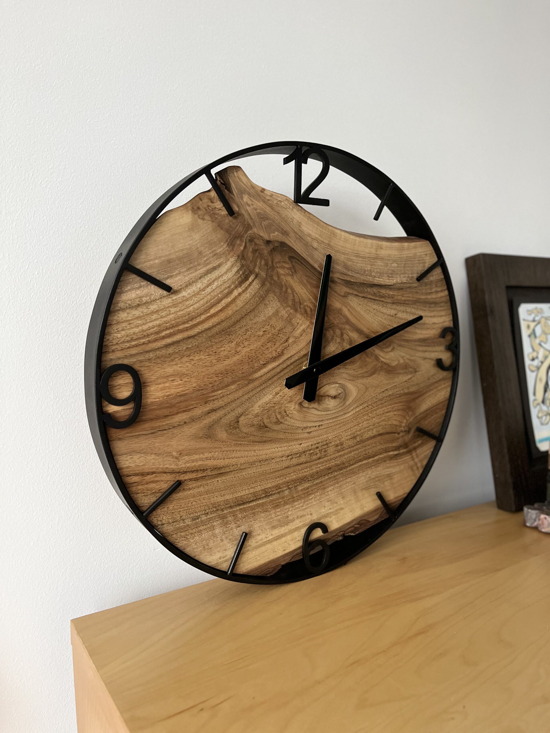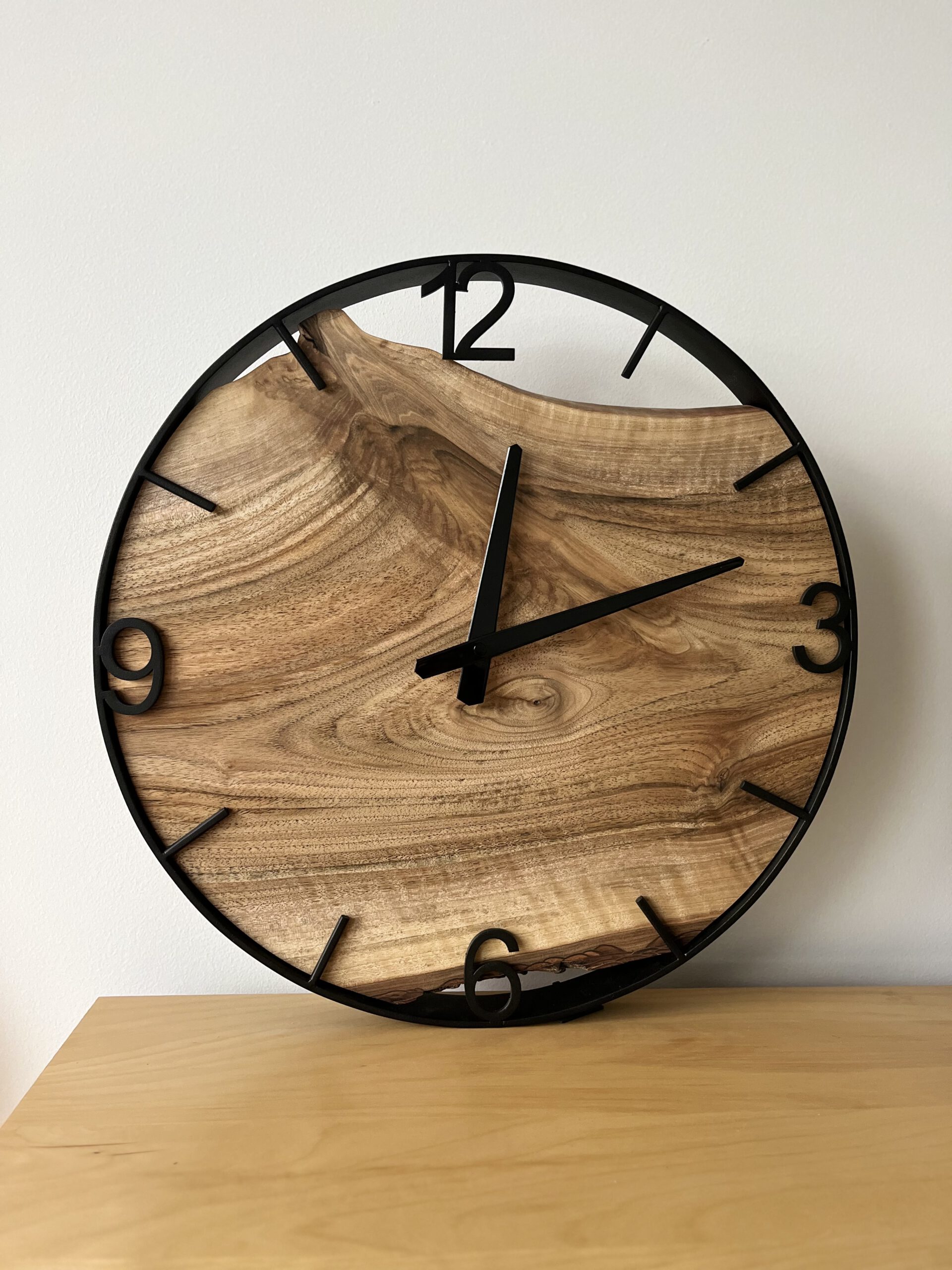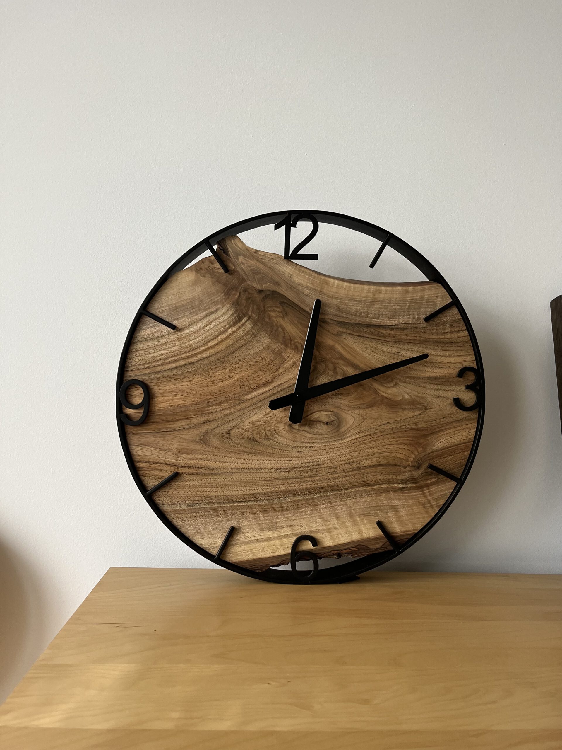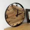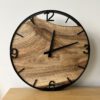 Zegar z drewna orzecha w stalowej obręczy ze znacznikami. Obręcz malowana proszkowo. Drewno pokryte zostało naturalnymi olejami.